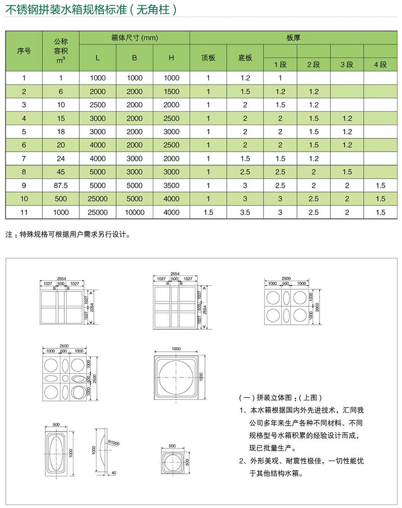不銹鋼水箱系列產品其單板規格:500×500mm、1000×500mm、 1000×1000mm,水箱可任意拼裝成1-1500噸,