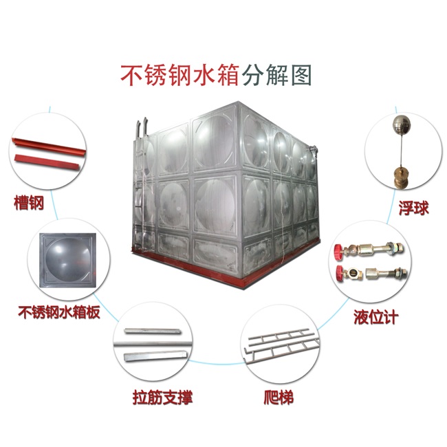 不銹鋼水箱是為了工程建設、高層住宅供水系統配套的專用貯供水設備。本產品選用進口國際通用食品級不銹鋼SUS304板材制造,新概念設計采用先進的模壓成型,氣體保護焊接等先進工藝制造,具有造型美觀、重量輕、造價低、壽命長、衛生無毒、用途廣等優點,是當今國際最優秀的貯供水設備。該水箱內貯存的水質經北京衛生防疫站鑒定,符合國家《生活飲用水衛生標準》(GB5479—85)的要求。